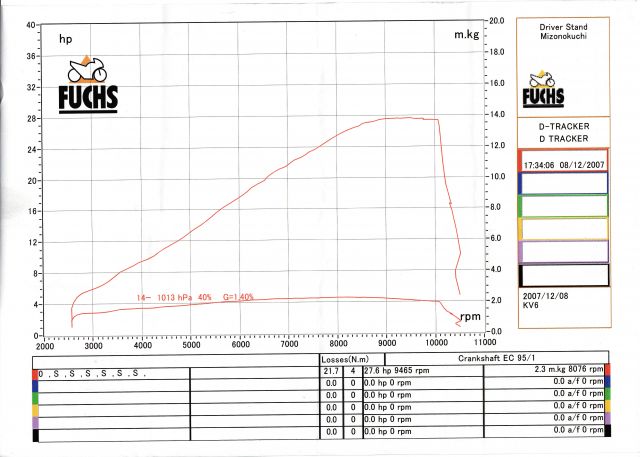 と、言う事でネタ作りに溝ノ口の2りんかんでパワーチェックして来ました。今年初めにホンダウイングミヤザキさんで計測して頂いた時は、馬力が27.2PS。トルクが2.2kgm。ワンシーズン戦い抜いて本日は27.6PSで2.3kgmでした。